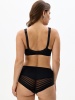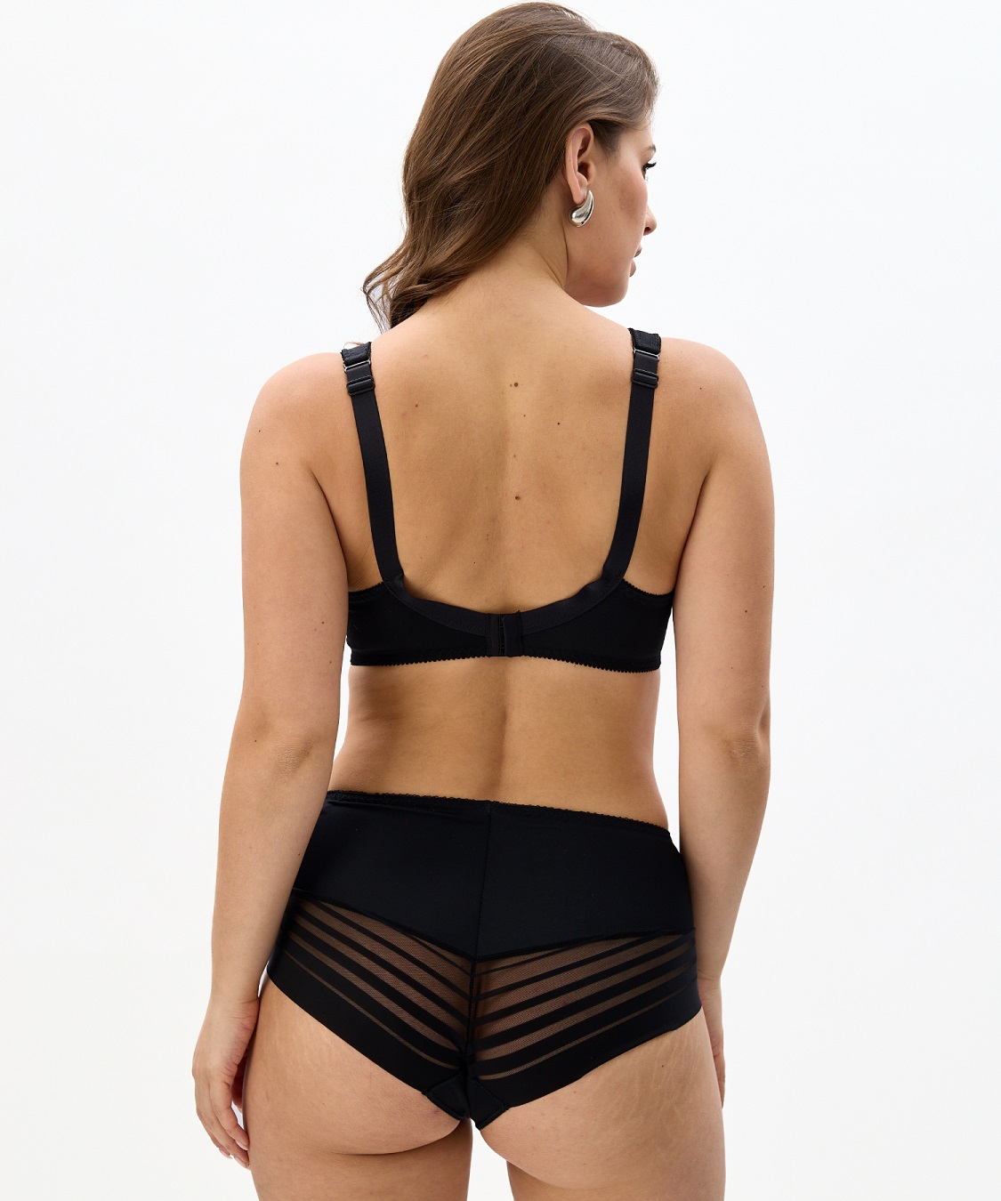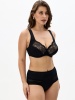 Бюстгальтер из эластичного полотна и неэластичного трикотажного полотна, на каркасах. Чашка мягкая, с боковой корректирующей деталью на дубляже с хлопком, переходящей в бретель. Верхняя деталь чашки из эластичного кружева. Отделка — бантик/украшение.