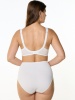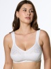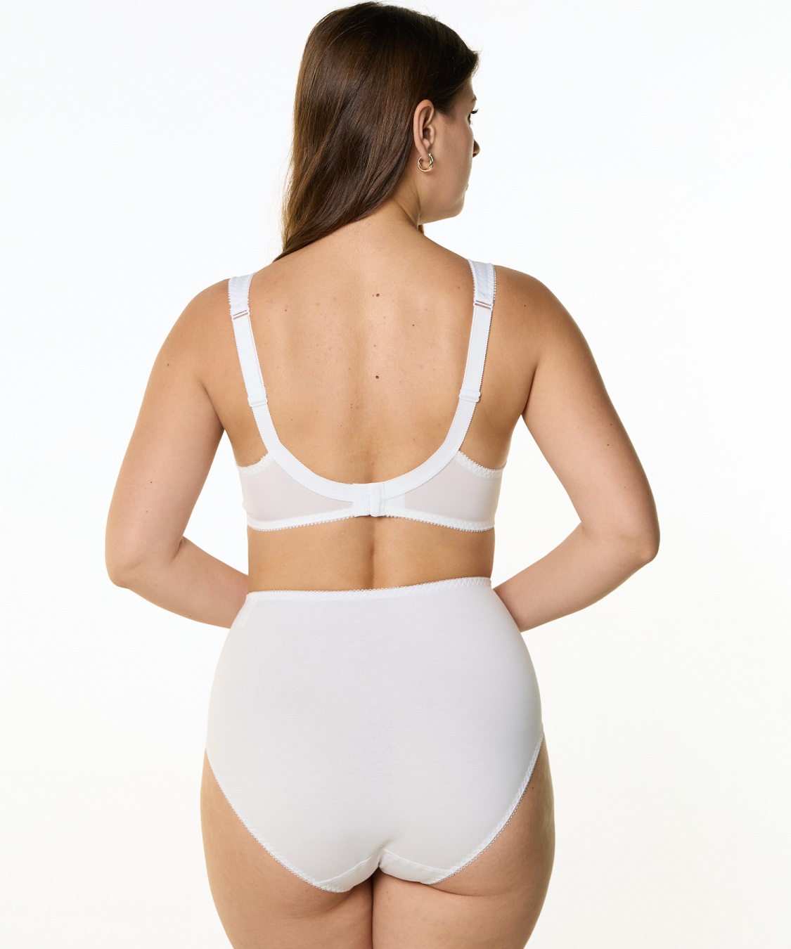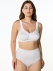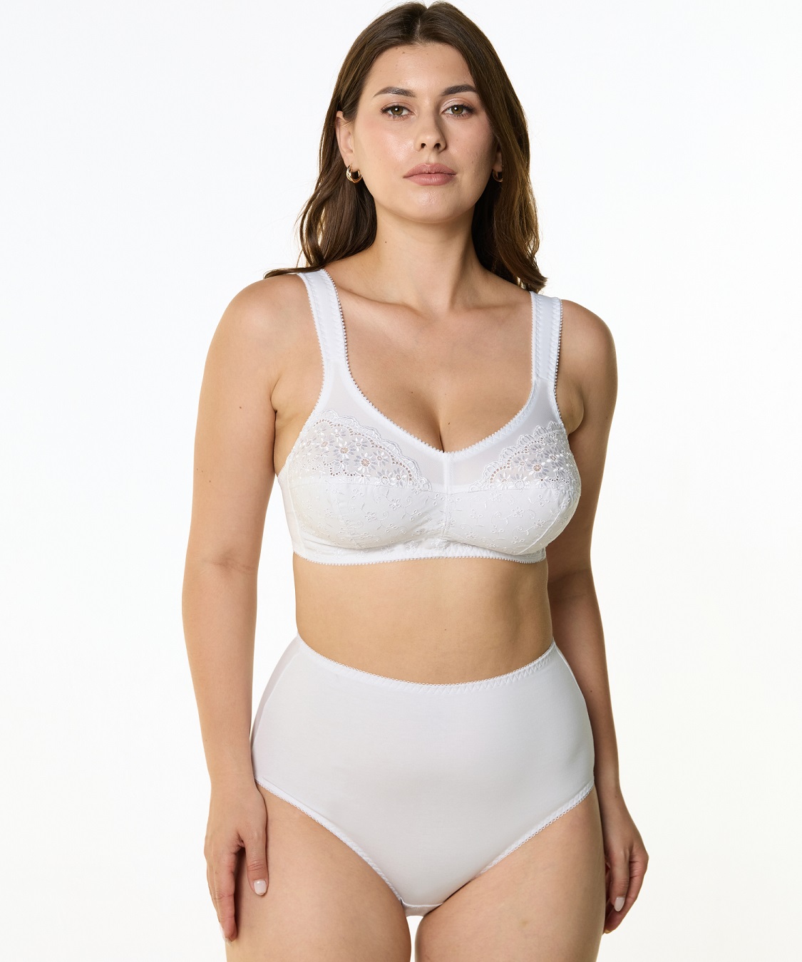 Бюстгальтер бескаркасный из х/б шитья, вышитого х/б полотна и эластичного полотна. Чашка мягкая, нижняя деталь чашки на подкладке из ситца. Бретель широкая на дубляже с хлопком.