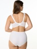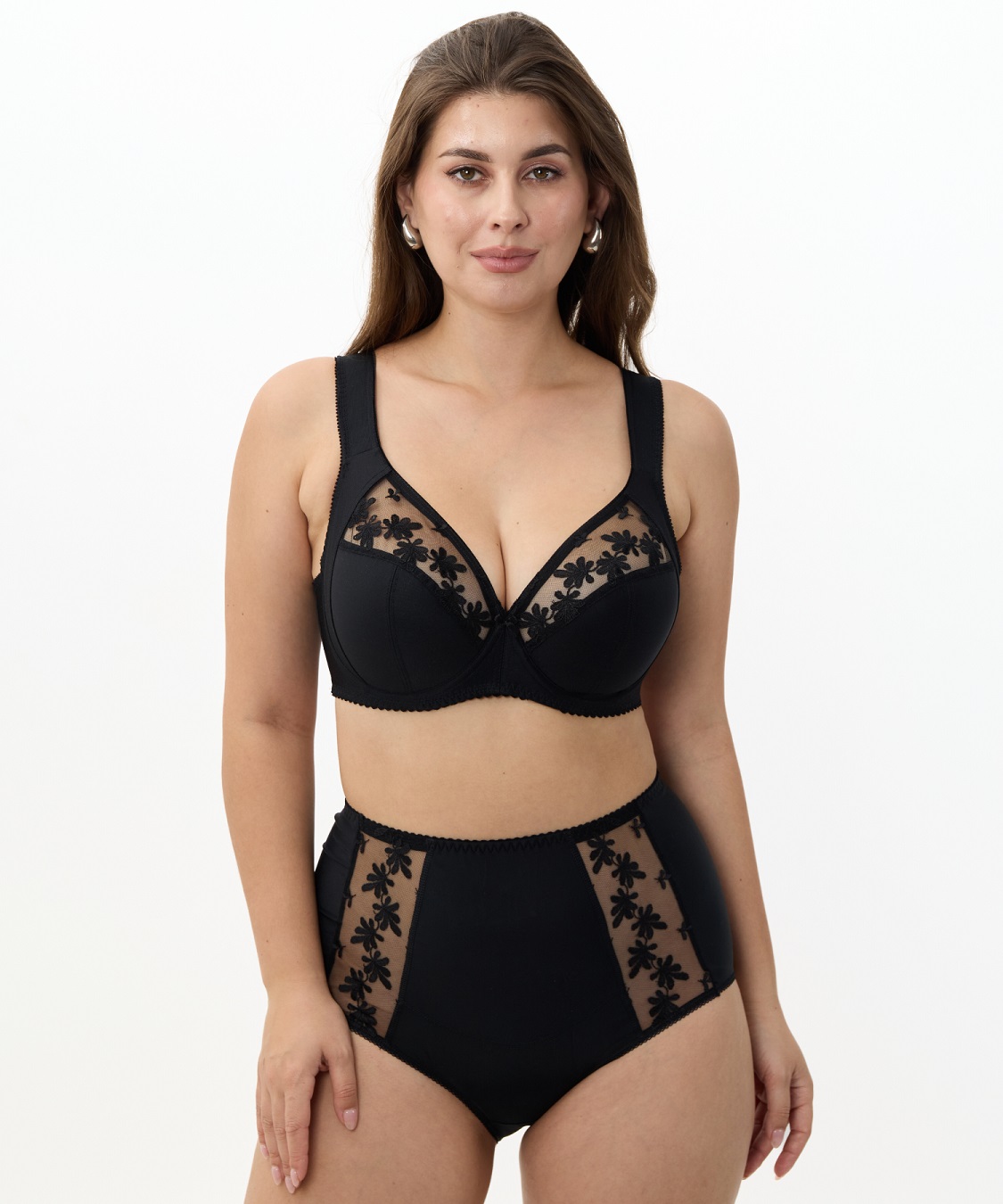 Бюстгальтер с мягкой чашкой, на каркасах. Чашка Т-образного членения с боковой корректирующей деталью, переходящей в широкую бретель на дубляже с хлопком. Нижняя деталь чашки из неэластичного функционального полотна, верхняя деталь из вышивки на неэластичной сетке. Упругие пластины в боковых деталях стана.