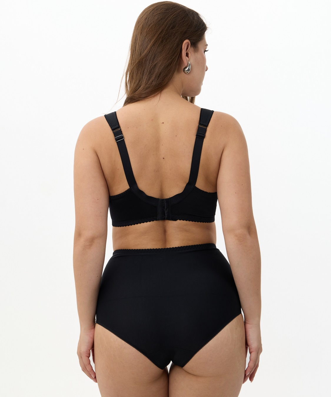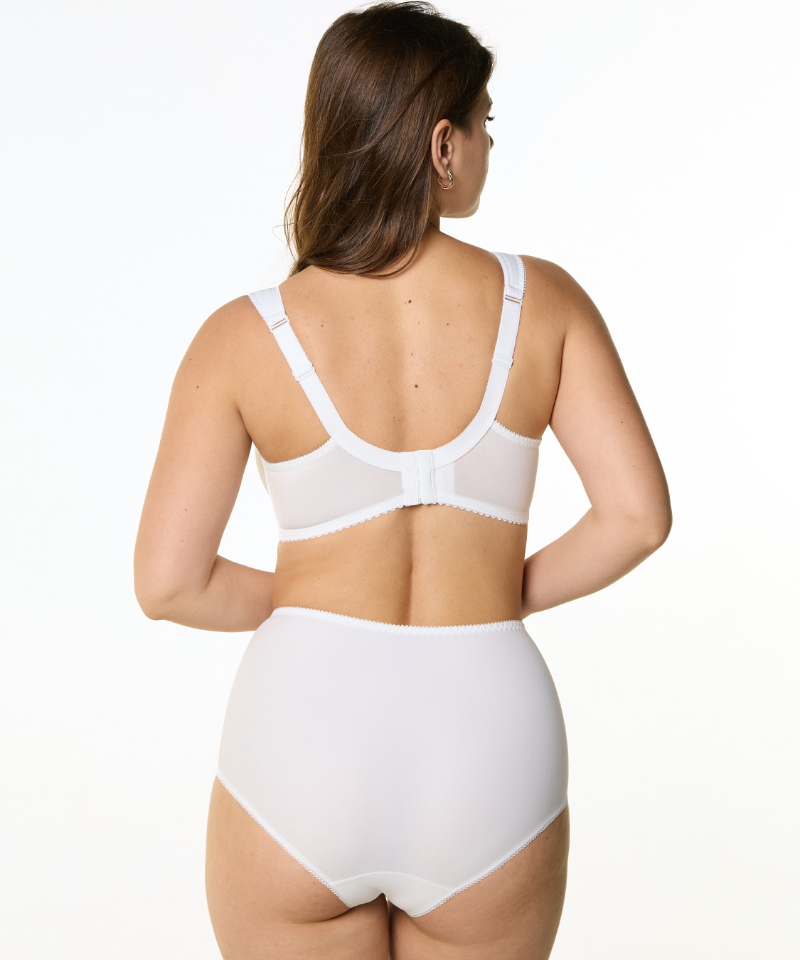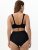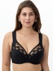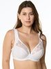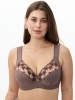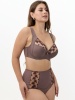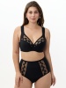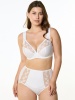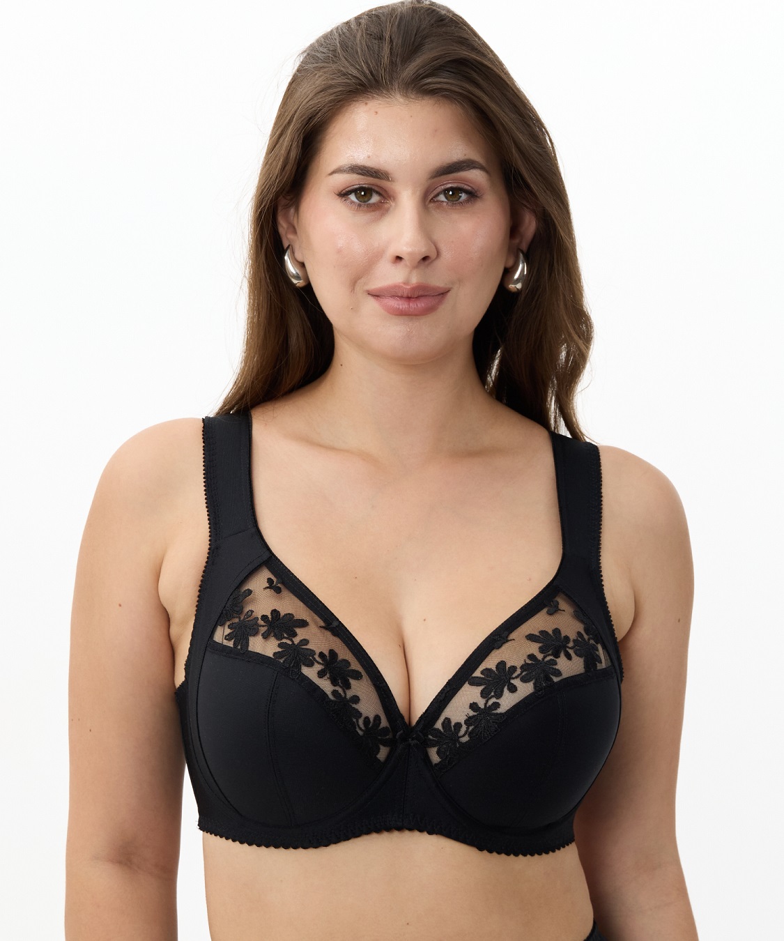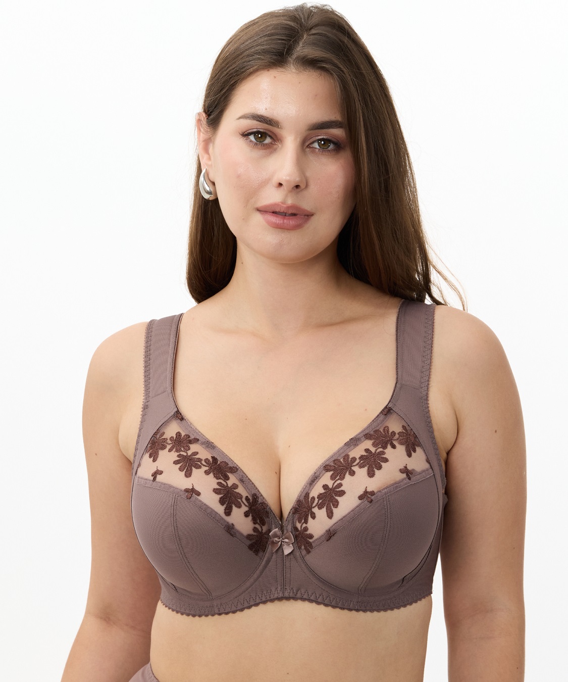 Бюстгальтер с мягкой чашкой, на каркасах. Чашка Т-образного членения с боковой корректирующей деталью, переходящей в широкую бретель на дубляже с хлопком. Нижняя деталь чашки из неэластичного функционального полотна, верхняя деталь из вышивки на неэластичной сетке. Упругие пластины в боковых деталях стана.