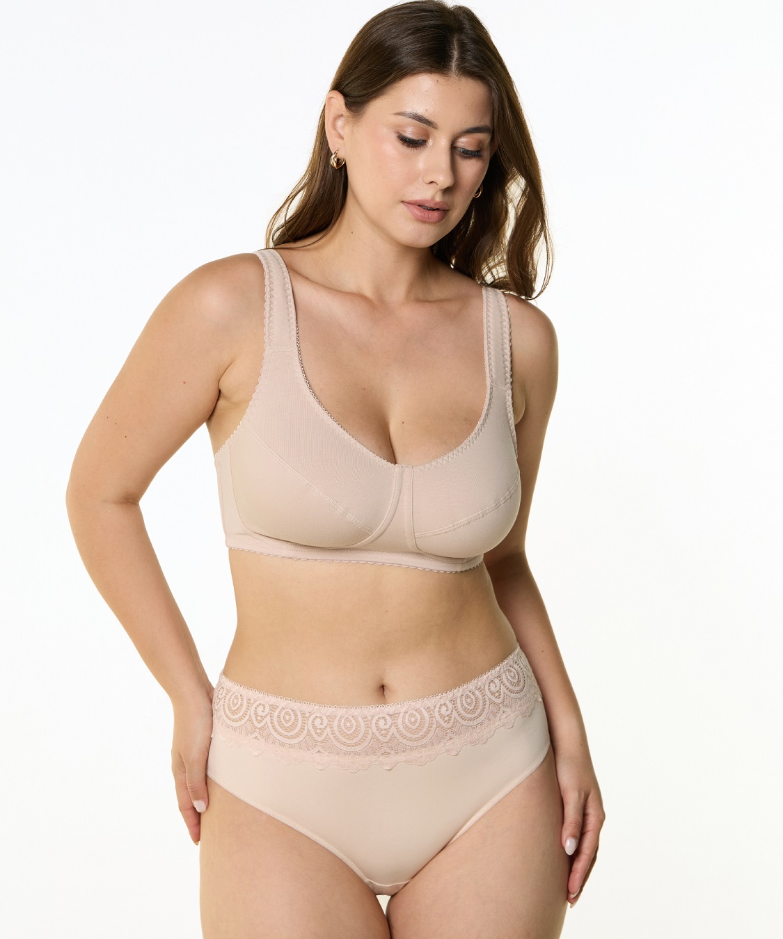 Бюстгальтер из трикотажного вискозного полотна с лайкрой. Чашка мягкая, на подкладке из х/б трикотажного полотна с лайкрой. Пояс с застежкой сзади на 2-3 крючка. Боковая деталь пояса усилена эластичной сеткой. Бретель широкая, на дубляже с хлопком, с регулировкой длины сзади.