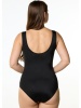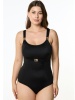 Слитный купальник из эластичного однотонного полотна с деликатным блеском, без каркасов. Формованные чашки вшиты. Передняя деталь усилена функциональной сеткой. Спинка с вырезом без застежки.Декоративные украшения на бретелях и пояске под грудью.