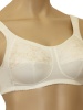 Бюстгальтер для фиксации протеза молочной железы из вышитого кружева на неэластичной сетке, трикотажного полотна, эластичного полотна с блеском, эластичного полотна, с втачными карманами для протеза из х/б трикотажного полотна. Чашка мягкая. Пояс с застежкой сзади на 2-4 крючка. Бретель широкая, на дубляже с хлопком, с регулировкой длины сзади.