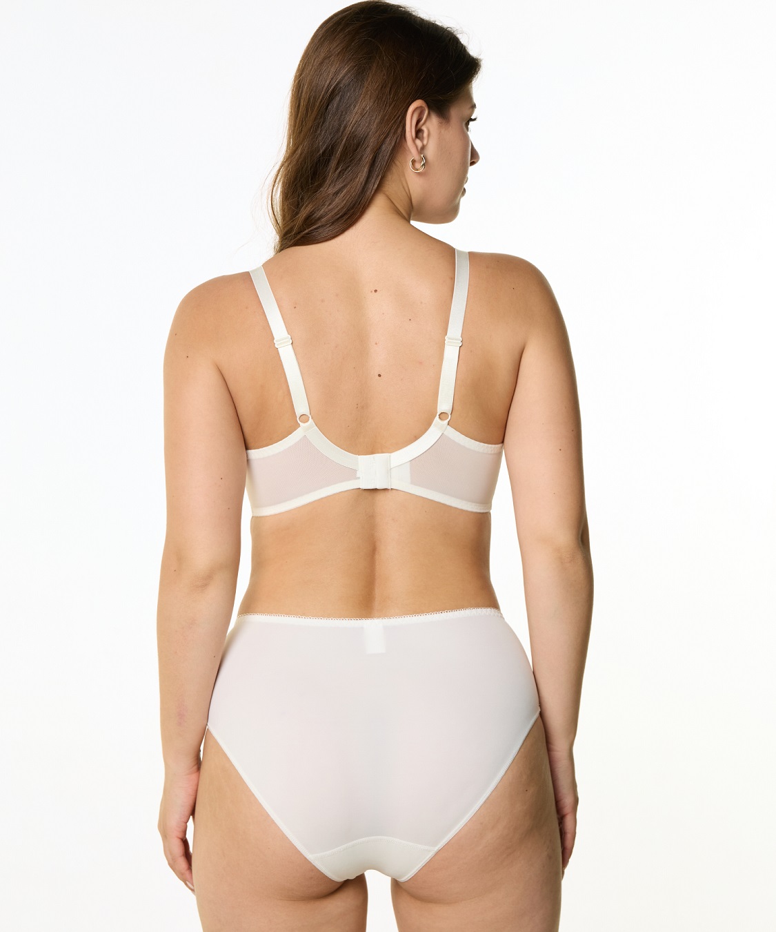 Трусы-слипы из эластичного полотна. На передней детали вставки из эластичной сетки и неэластичной вышивки. Высокая линия талии.